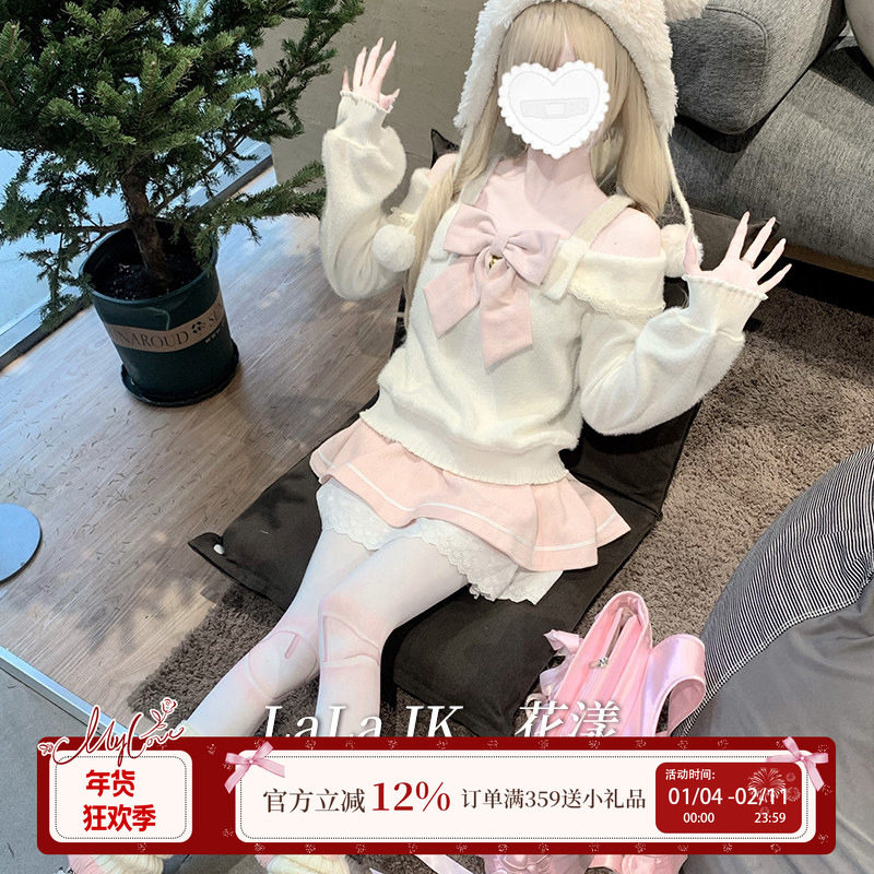 啦啦酱 花漾 宅系软糯一字肩毛绒上衣蝴蝶结蕾丝粉色半裙套装裙女