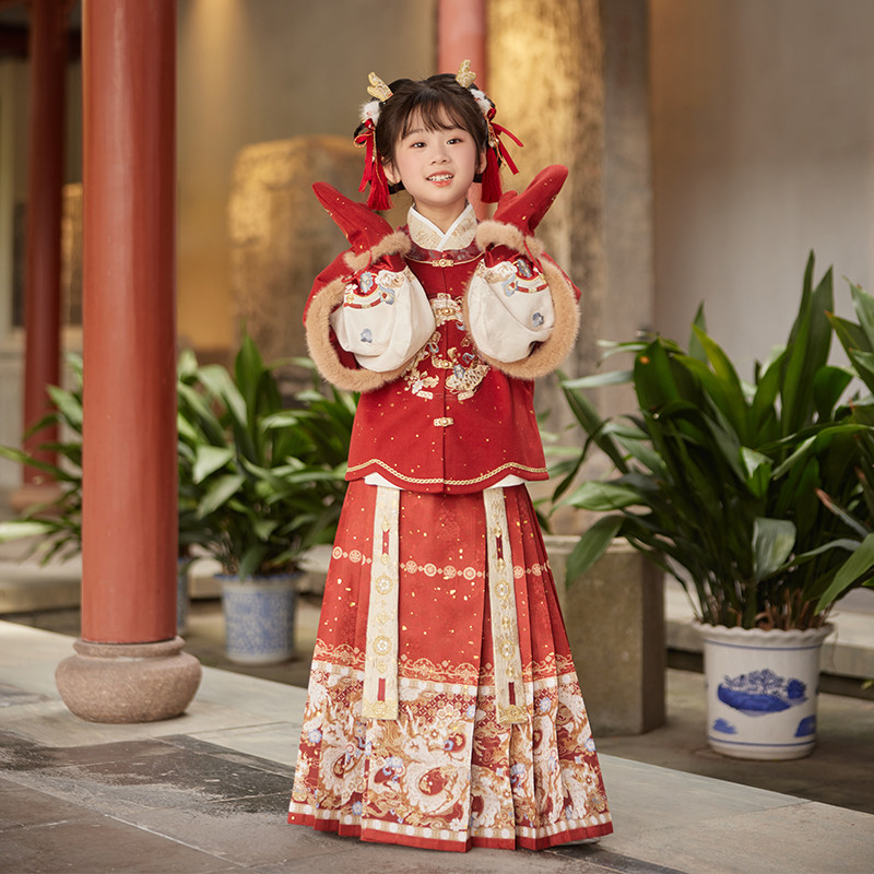 十三余童装【瑞龙启岁】明制新年拜年服冬季女童过年马面裙套装红