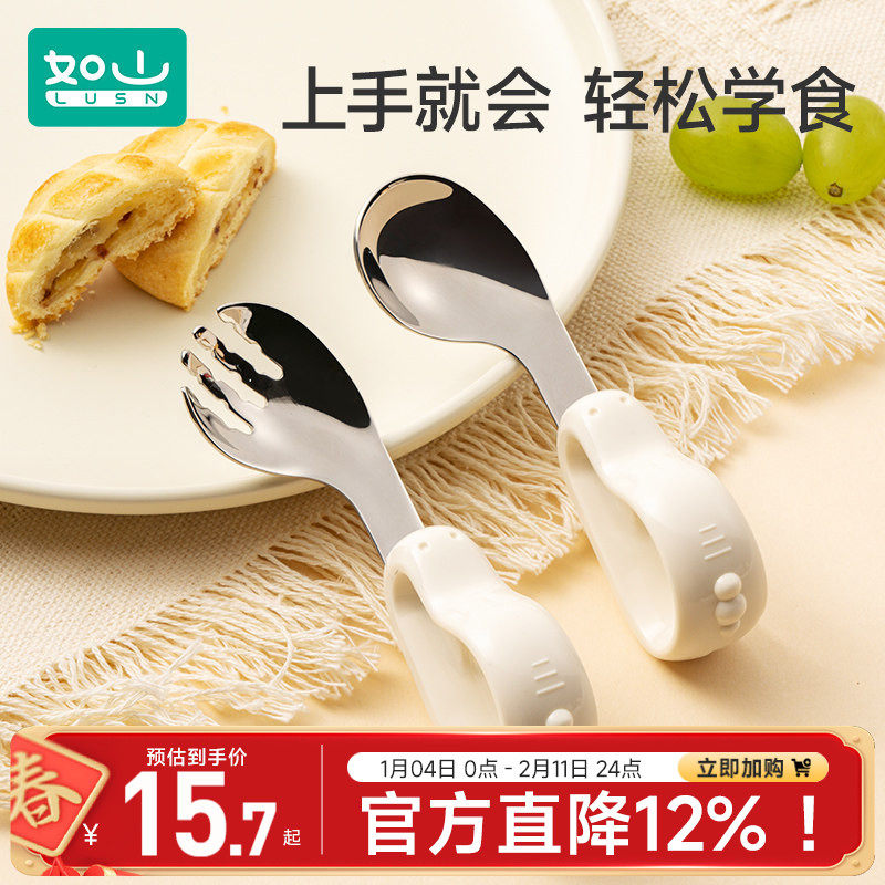 如山宝宝自主进食辅食勺子婴儿学吃饭训练儿童不锈钢餐具元宝叉勺
