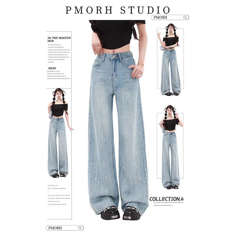 PMORH复古重工浅蓝色烫钻牛仔裤女秋冬设计感高腰宽松直筒阔腿裤