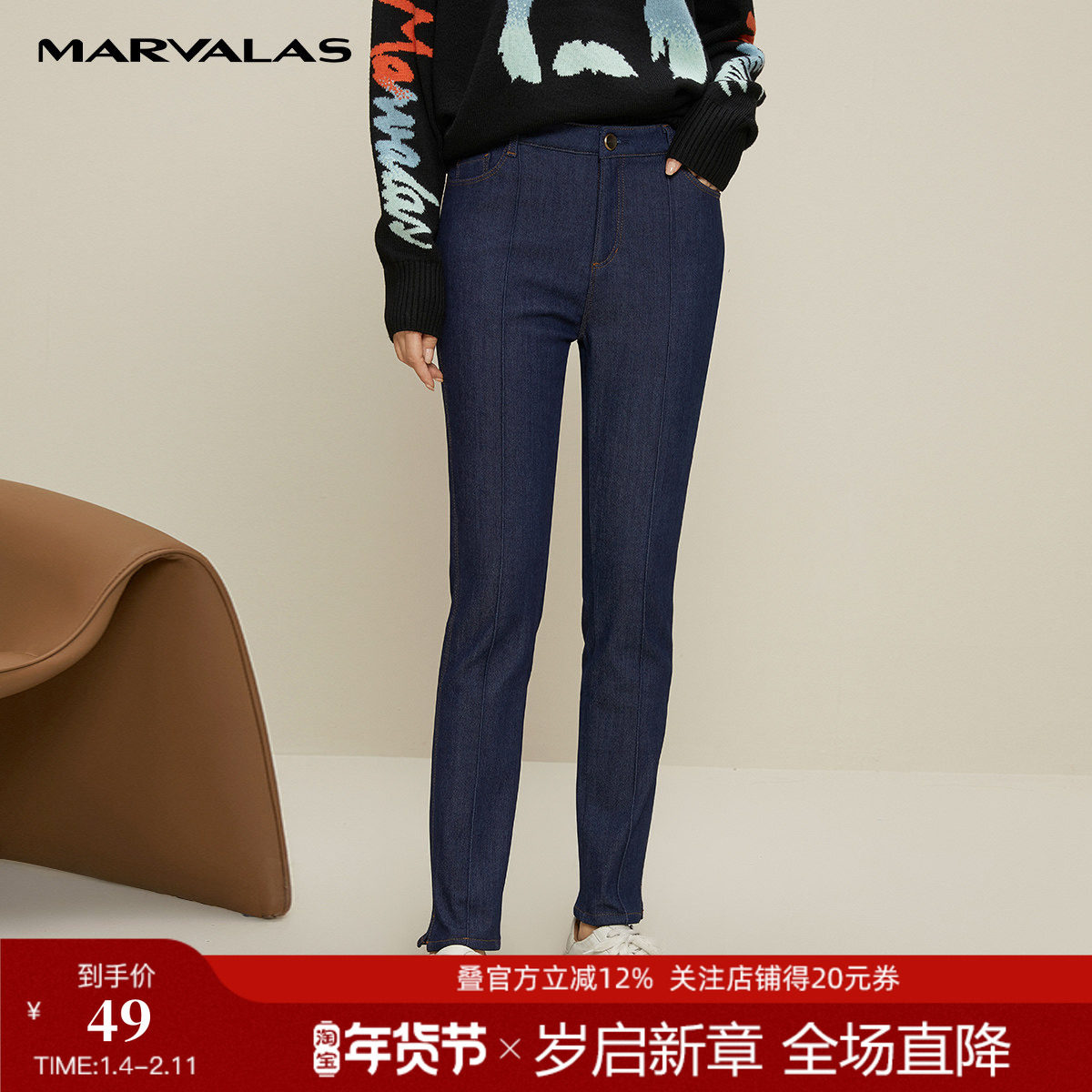 曼德诗开叉裤脚蓝色牛仔裤女2025冬季新品修身混棉加绒保暖直筒裤