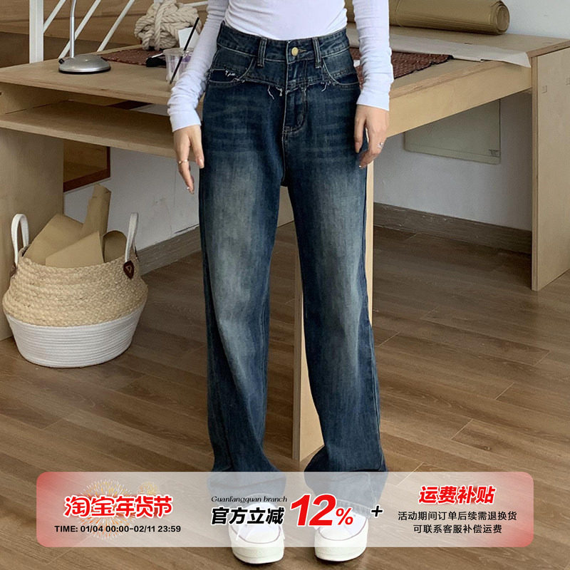 复古深蓝色牛仔裤女秋冬胖mm宽松显瘦梨形身材遮胯直筒阔腿长裤子