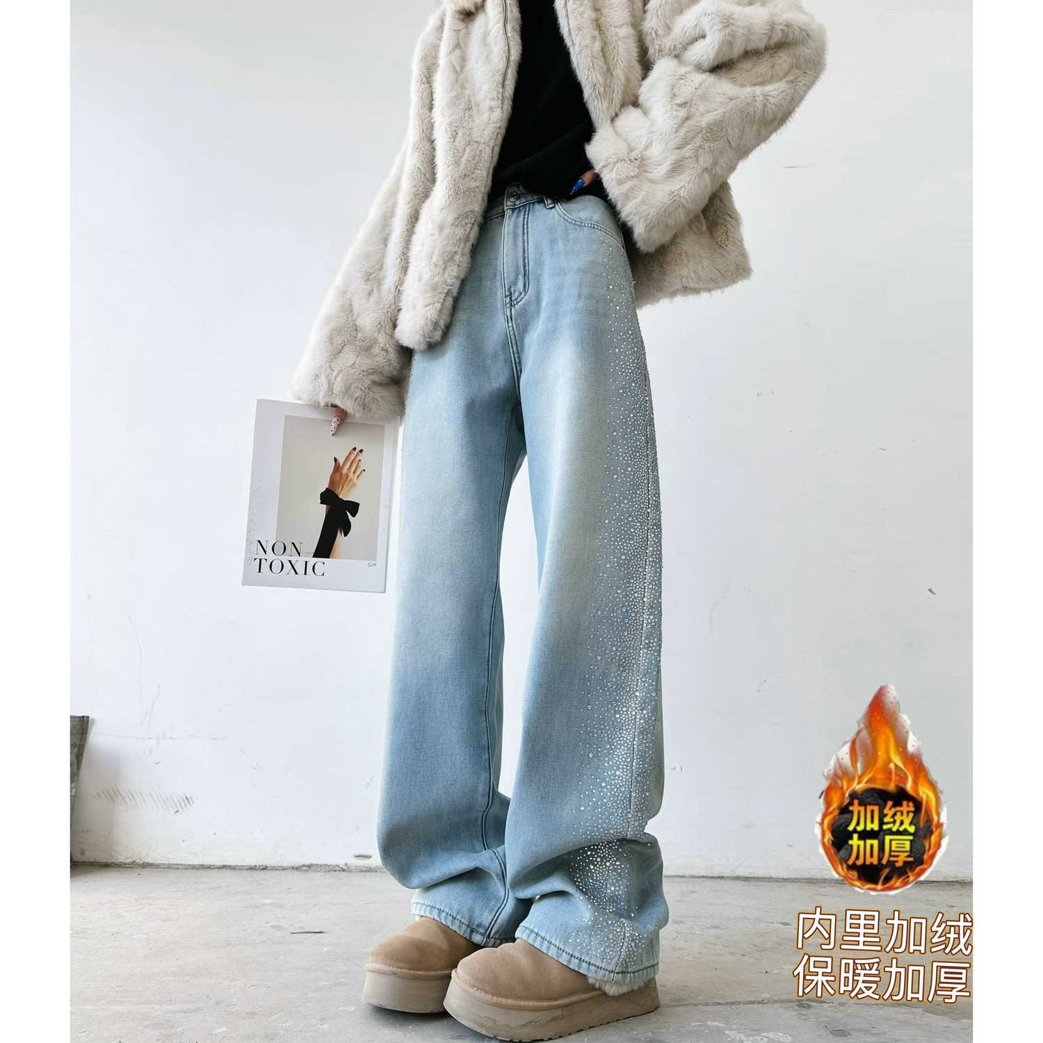 高个子加长女裤秋冬加绒加厚蓝色星河烫钻阔腿牛仔裤女宽松拖地裤