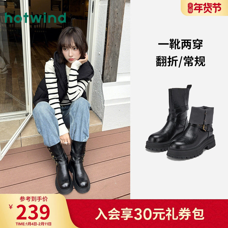 热风厚底骑士靴女2025年冬季新款黑色百搭短筒靴子时装靴机车靴