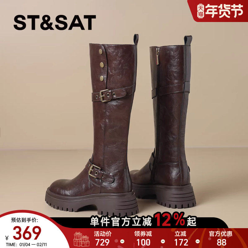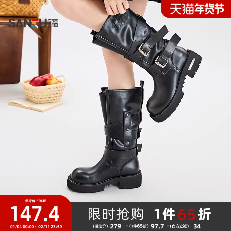 星期六两穿皮带扣机车靴女靴子2025新款秋季西部厚底骑士靴长筒靴