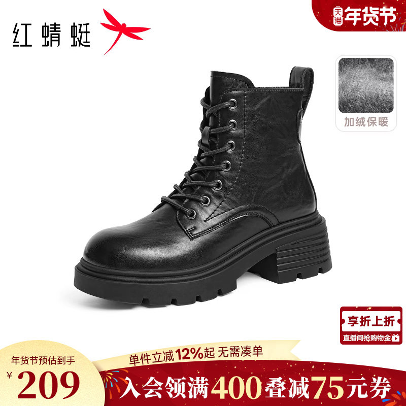 红蜻蜓马丁靴女秋冬新款女鞋厚底系带粗跟短筒靴加绒复古机车靴子