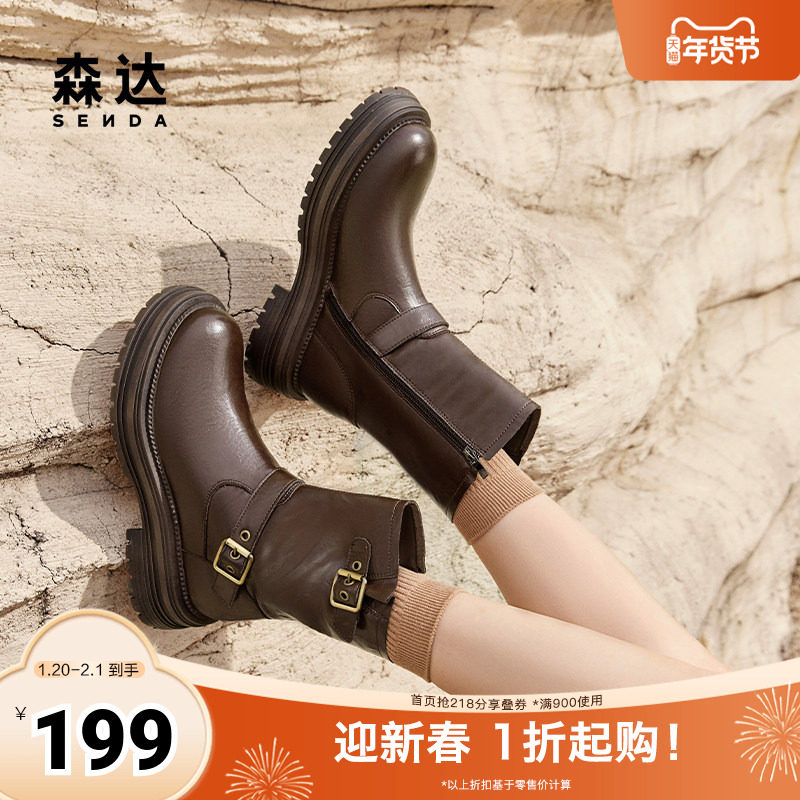 森达马丁靴女鞋冬商场同款真皮机车风绒里中筒靴XEC01DZ4