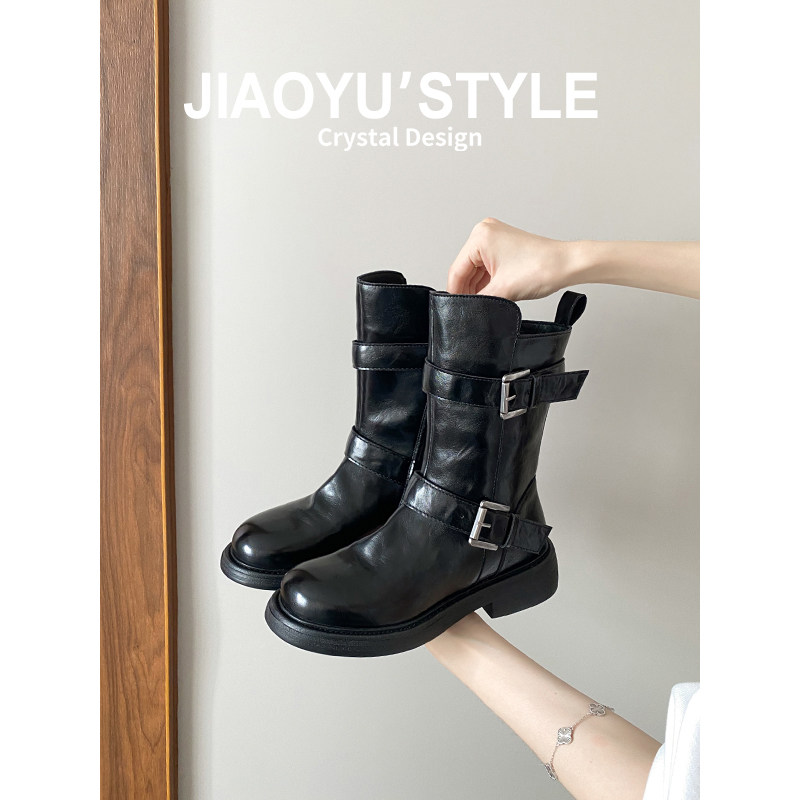 牛皮版~韩版复古机车靴女2025新款圆头显瘦搭扣靴子百搭棕色短靴