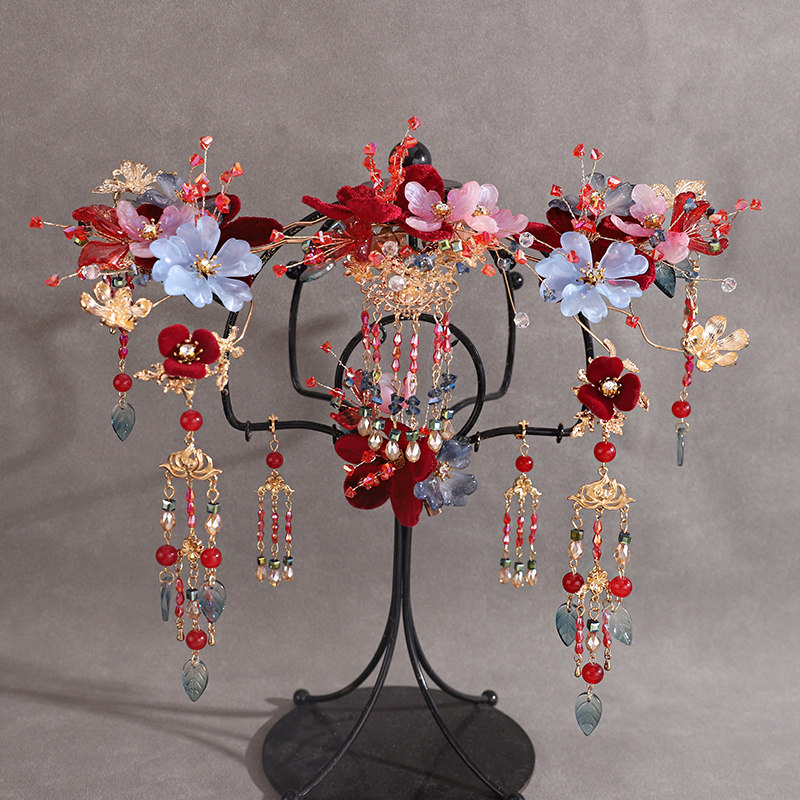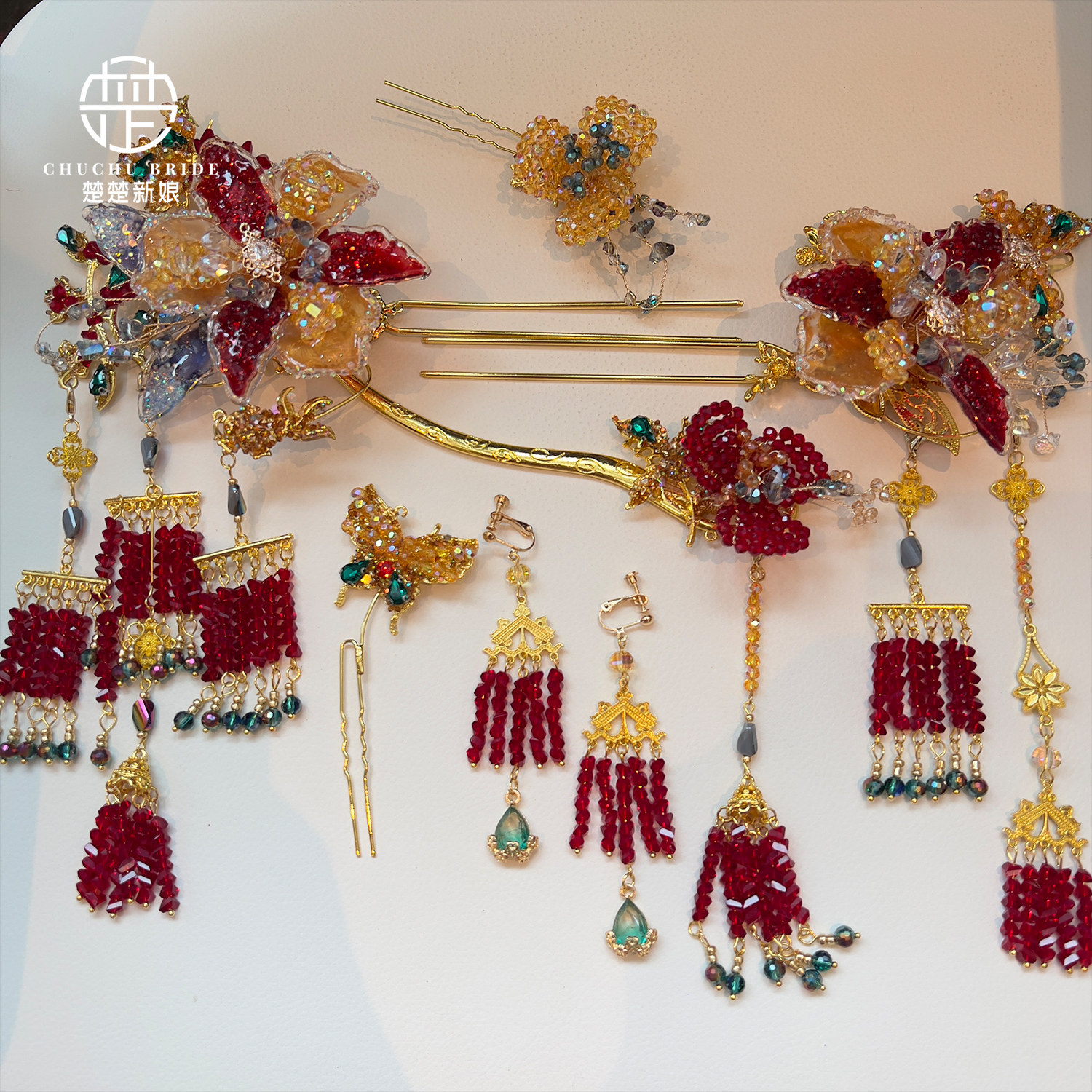 新娘头饰酒红色花朵古装中式古风秀禾结婚发饰龙凤褂减龄喜庆头饰
