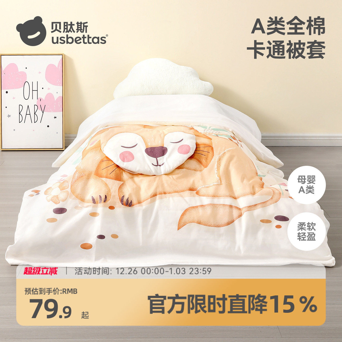 贝肽斯婴儿被套纯棉a类宝宝全棉被罩儿童120*150幼儿园床品套件
