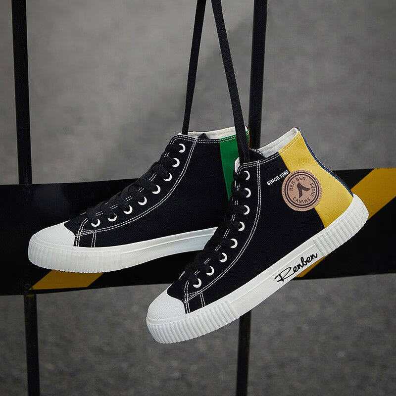 人本春季新款撞色高帮帆布鞋女情侣款复古板鞋女士百搭潮鞋女17.9