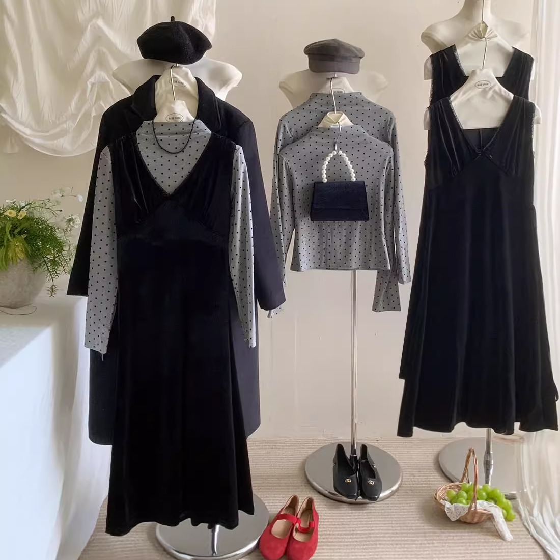 法式温柔风丝绒黑色背心连衣裙女秋冬立领波点打底上衣长裙两件套