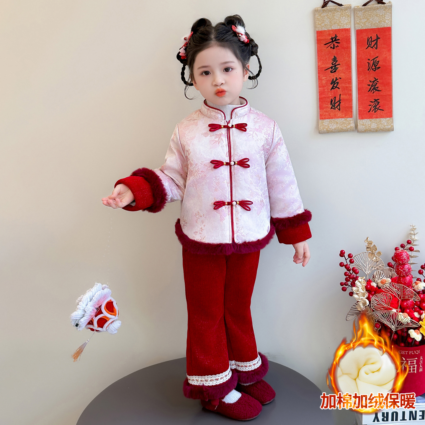汉服女童唐装冬季加绒喇叭裤套装中国风儿童古装女宝宝过年拜年服