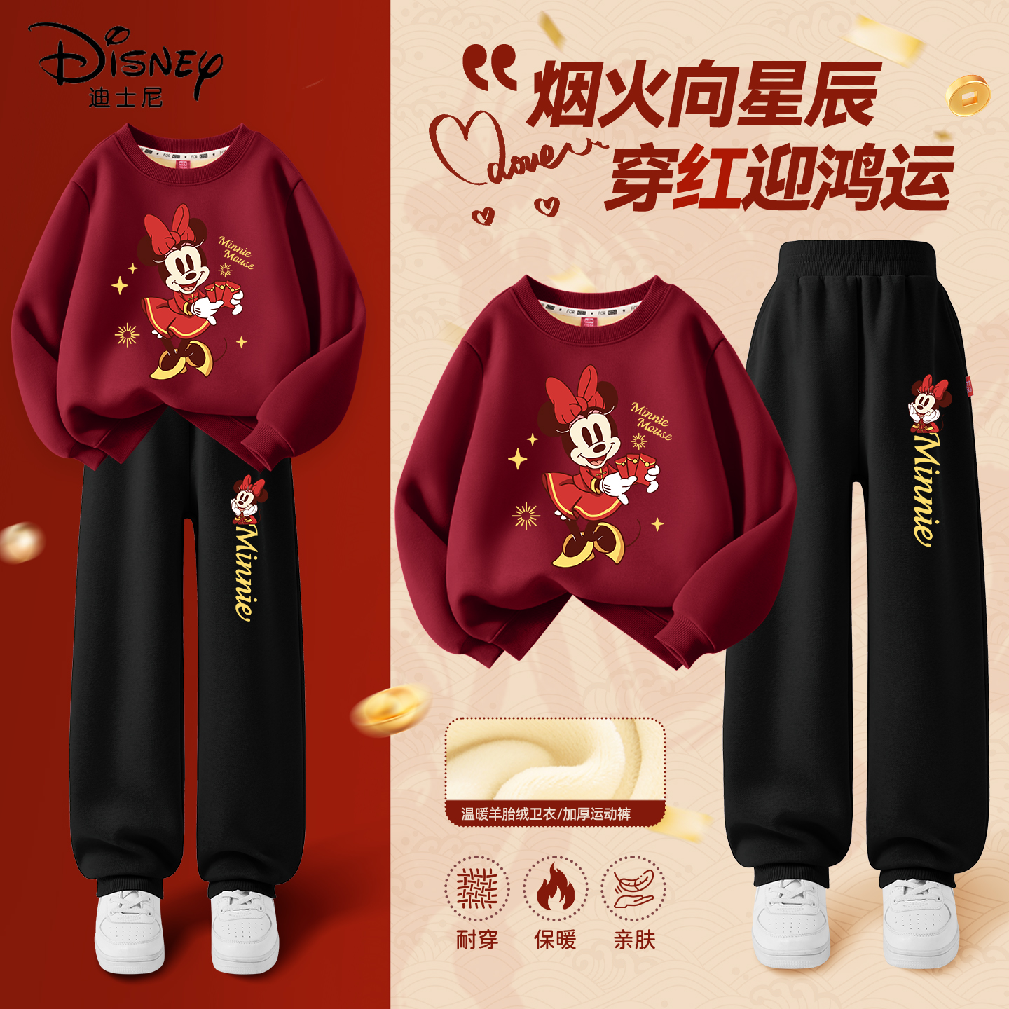 迪士尼拜年服女童唐装冬天加厚保暖一体绒2025新款儿童冬装两件套