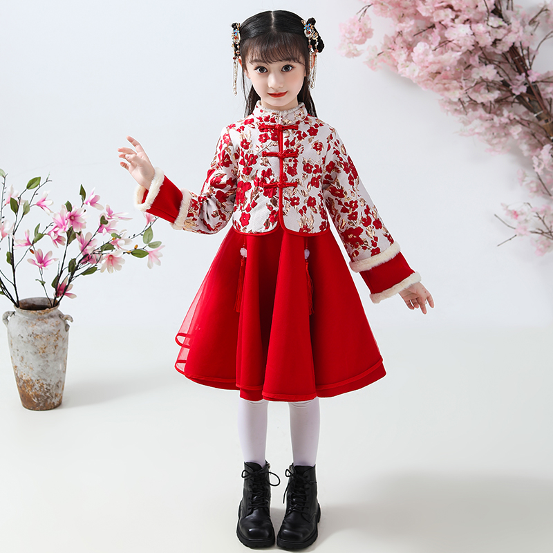 汉服女童冬季加绒古装拜年服女孩秋冬装国风过年加厚唐装连衣裙子