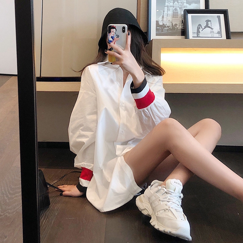 宽松大码衬衫长款过膝连衣裙bf休闲学生时尚衬衣百搭显瘦打底衫潮