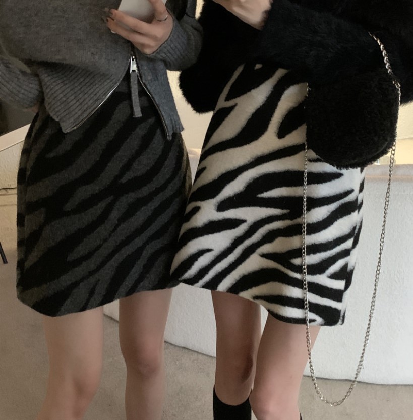大码斑马纹毛呢半身裙秋冬高腰遮胯a字短裙胖MM防走光显瘦包臀裙