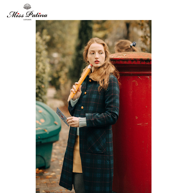 MP英伦复古原创 经典格子高级毛领可拆卸 重工艺呢子长款大衣外套