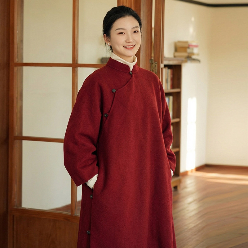 知笔墨松弛感红色双面呢子长款大衣女 国风中式立领新年战袍外套
