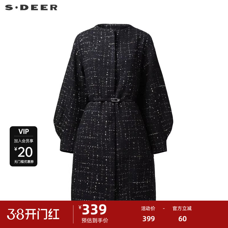 sdeer圣迪奥女装圆领格纹收腰呢子长款大衣S224Z2595