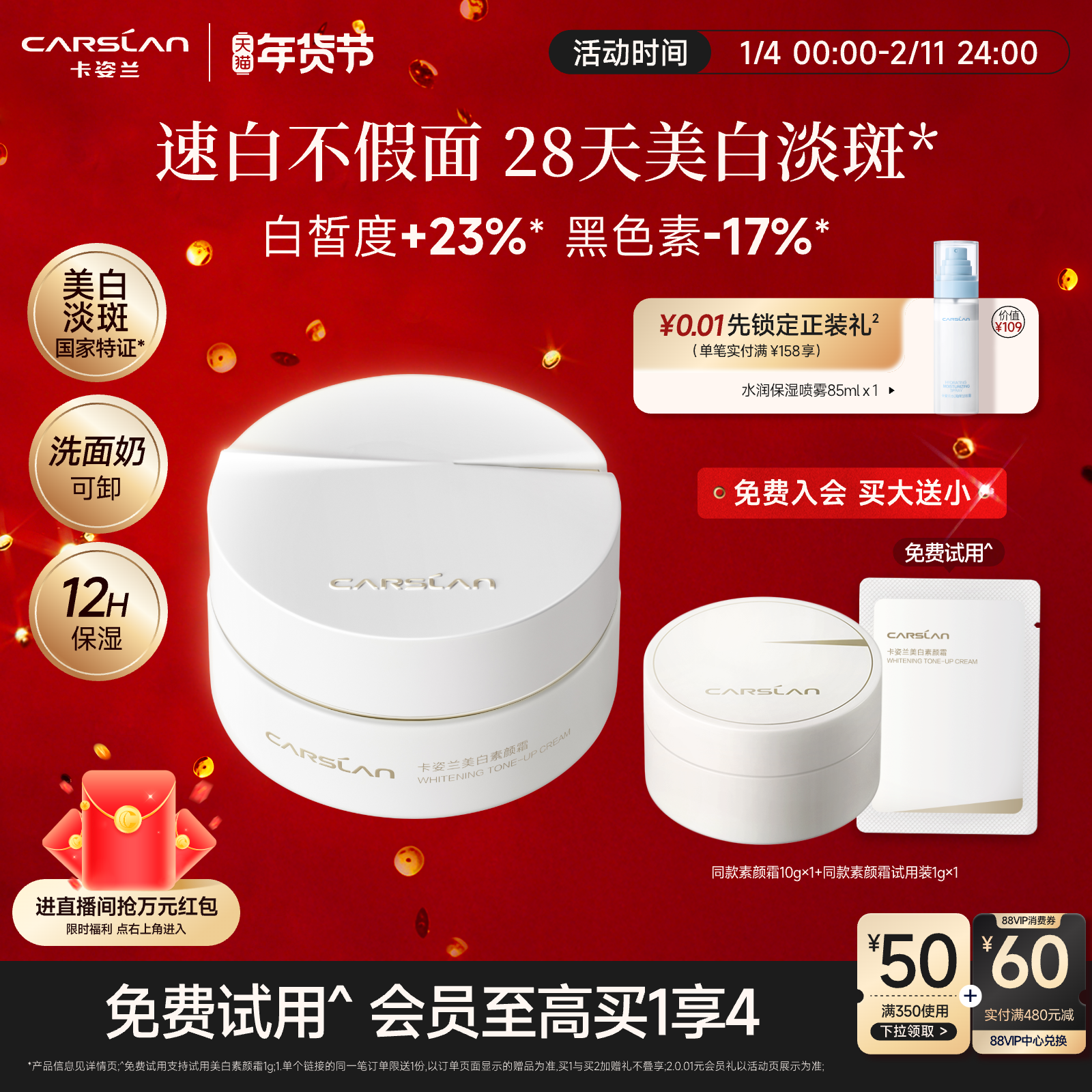 卡姿兰美白素颜霜脸部养肤淡斑面霜自然提亮肤色裸妆懒人礼物官方