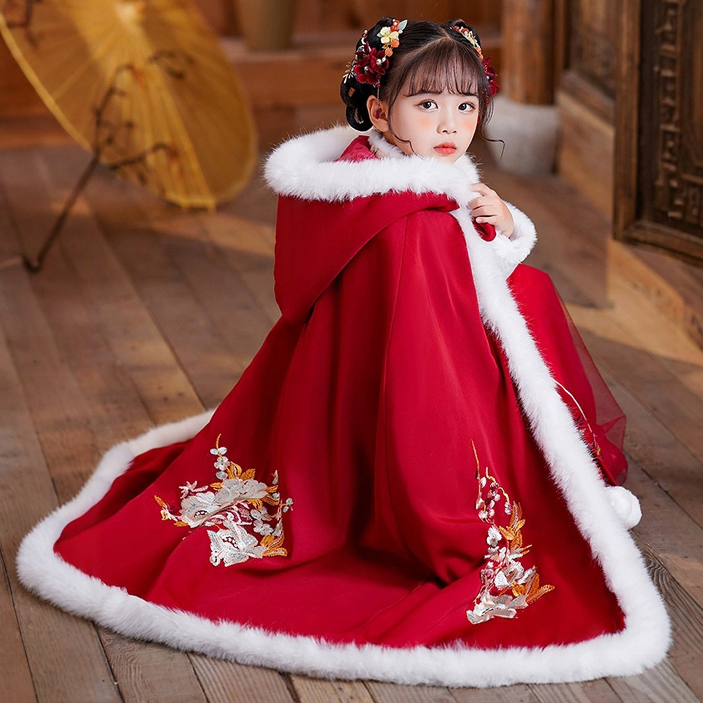 女童汉服披风冬季加厚保暖中国风斗篷外出长款外套女孩喜庆拜年服