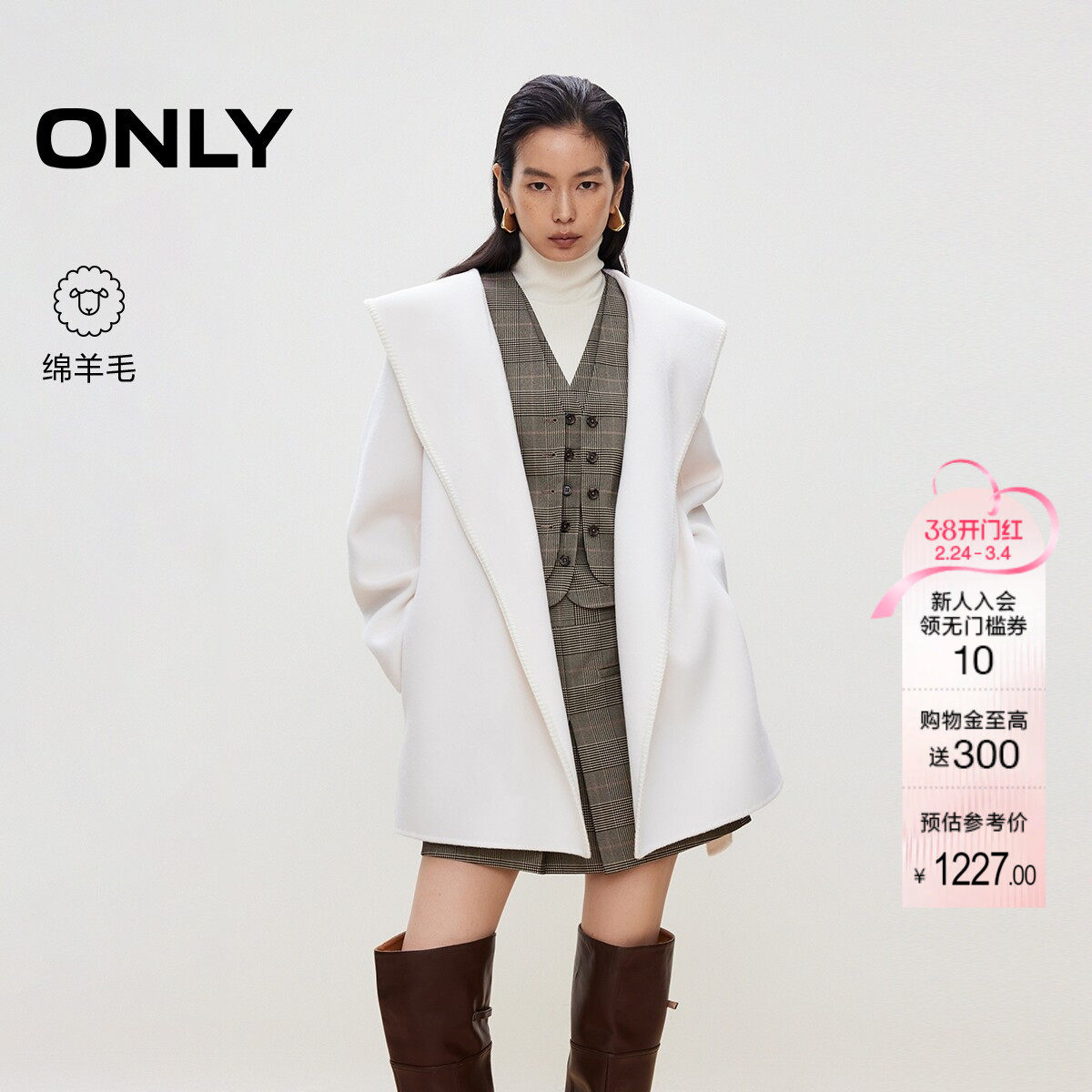 ONLY2025冬季新款慵懒风大兜帽斗篷系带绵羊毛双面毛呢大衣外套女