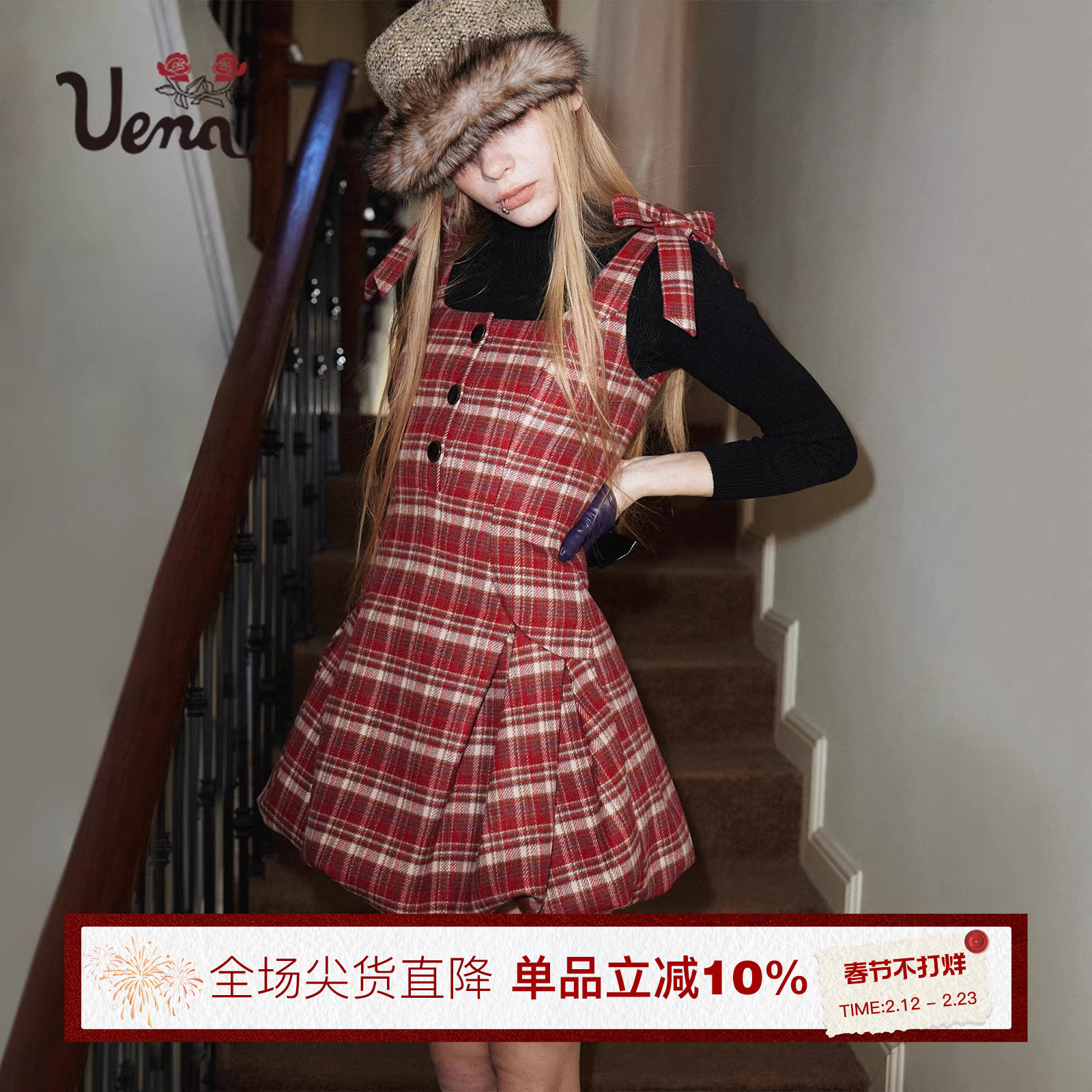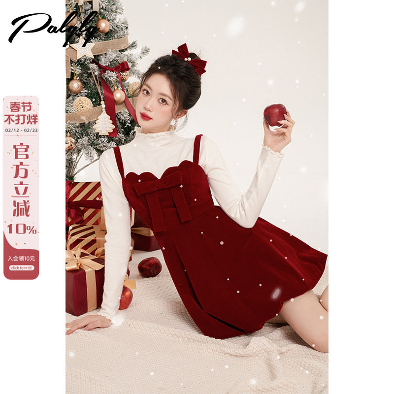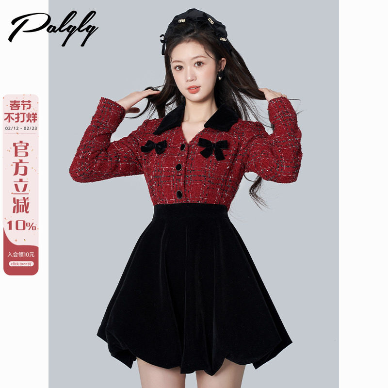 Palglg小香风红色格子假两件连衣裙女冬季法式圣诞穿搭蓬蓬加厚裙