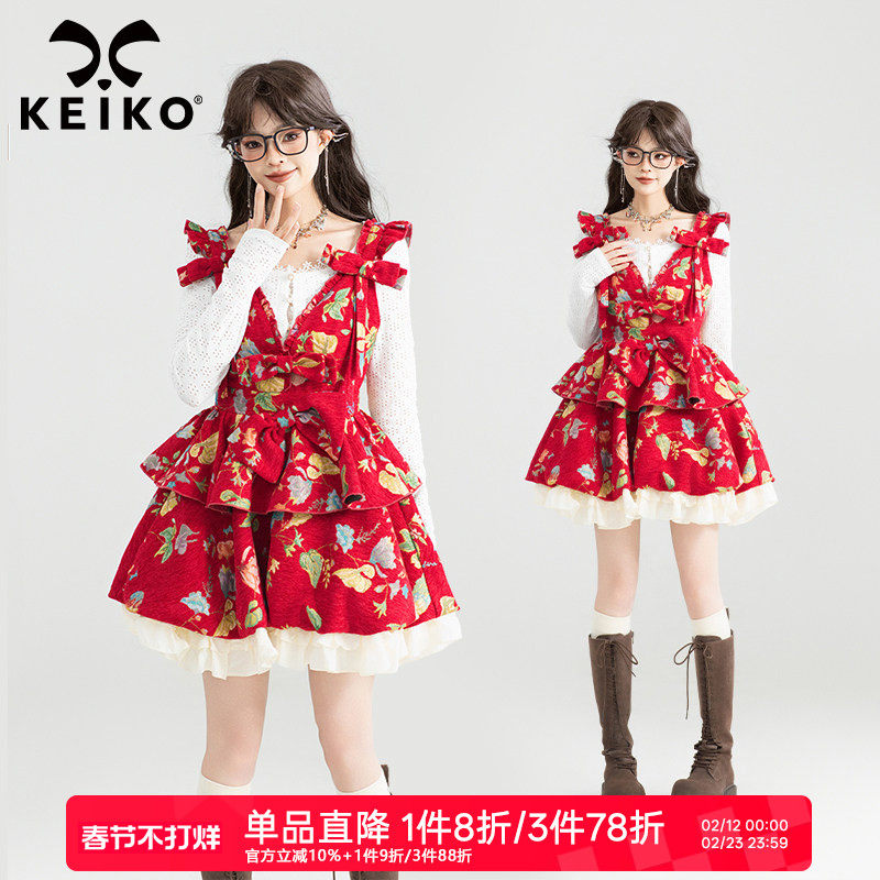 KEIKO 蝴蝶结饰提花红色花苞连衣裙春季新年氛围感蓬蓬吊带公主裙