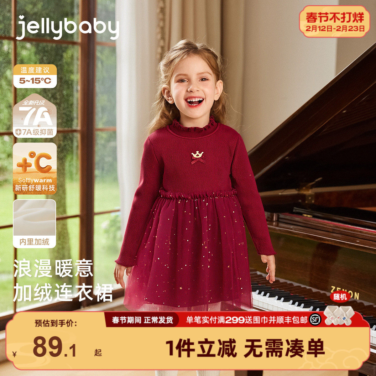 英氏女童连衣裙春季公主裙春秋蓬蓬裙女宝宝生日红色拜年新年裙子