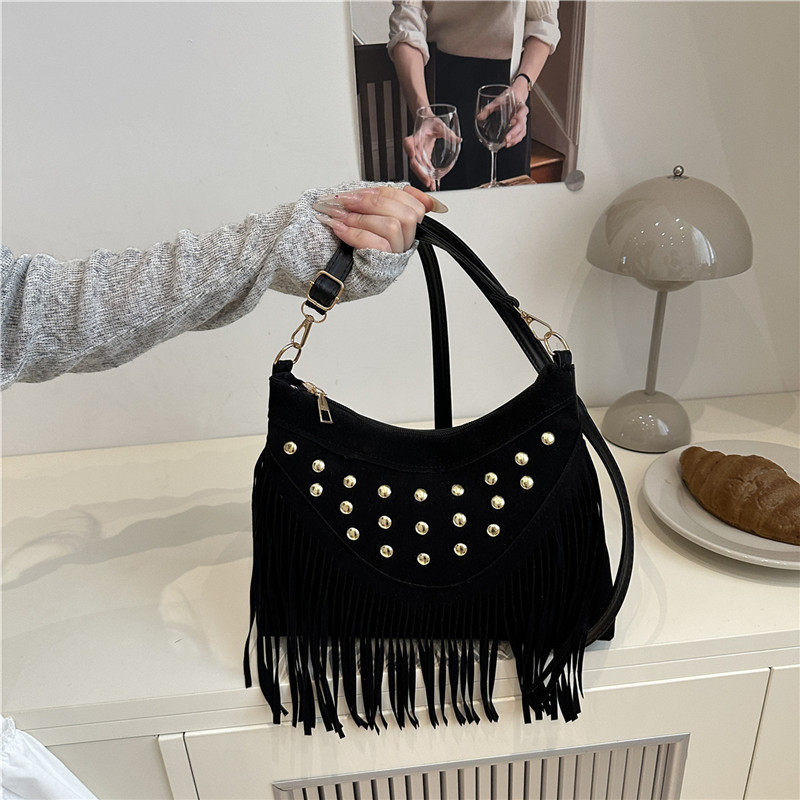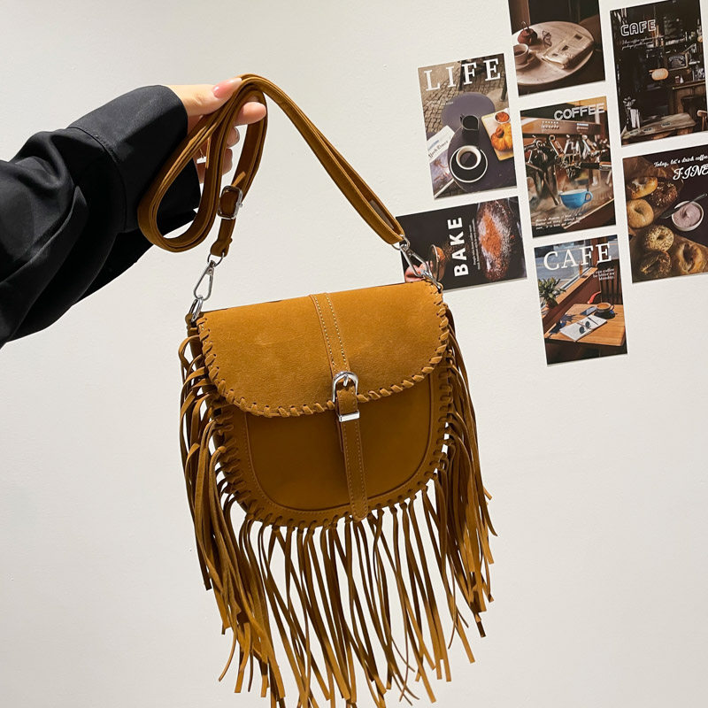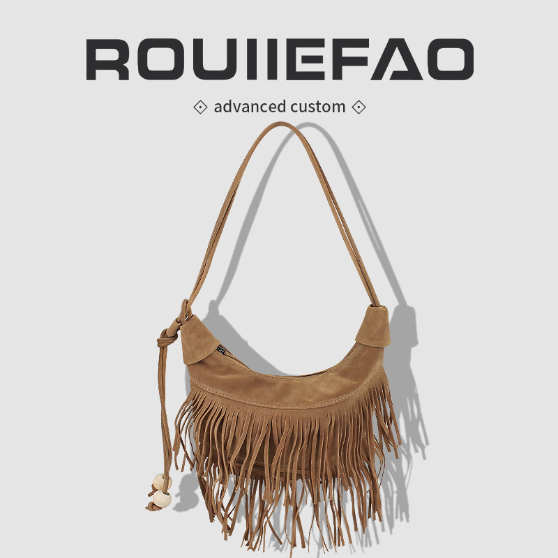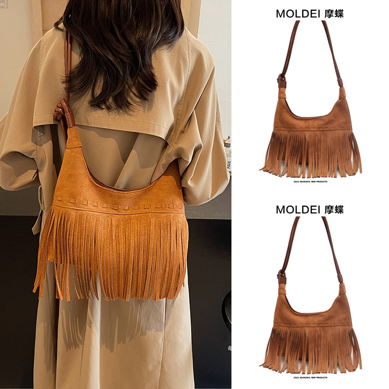 波西米亚磨砂麂皮绒流苏包包女复古时尚百搭斜跨单肩包腋下饺子包