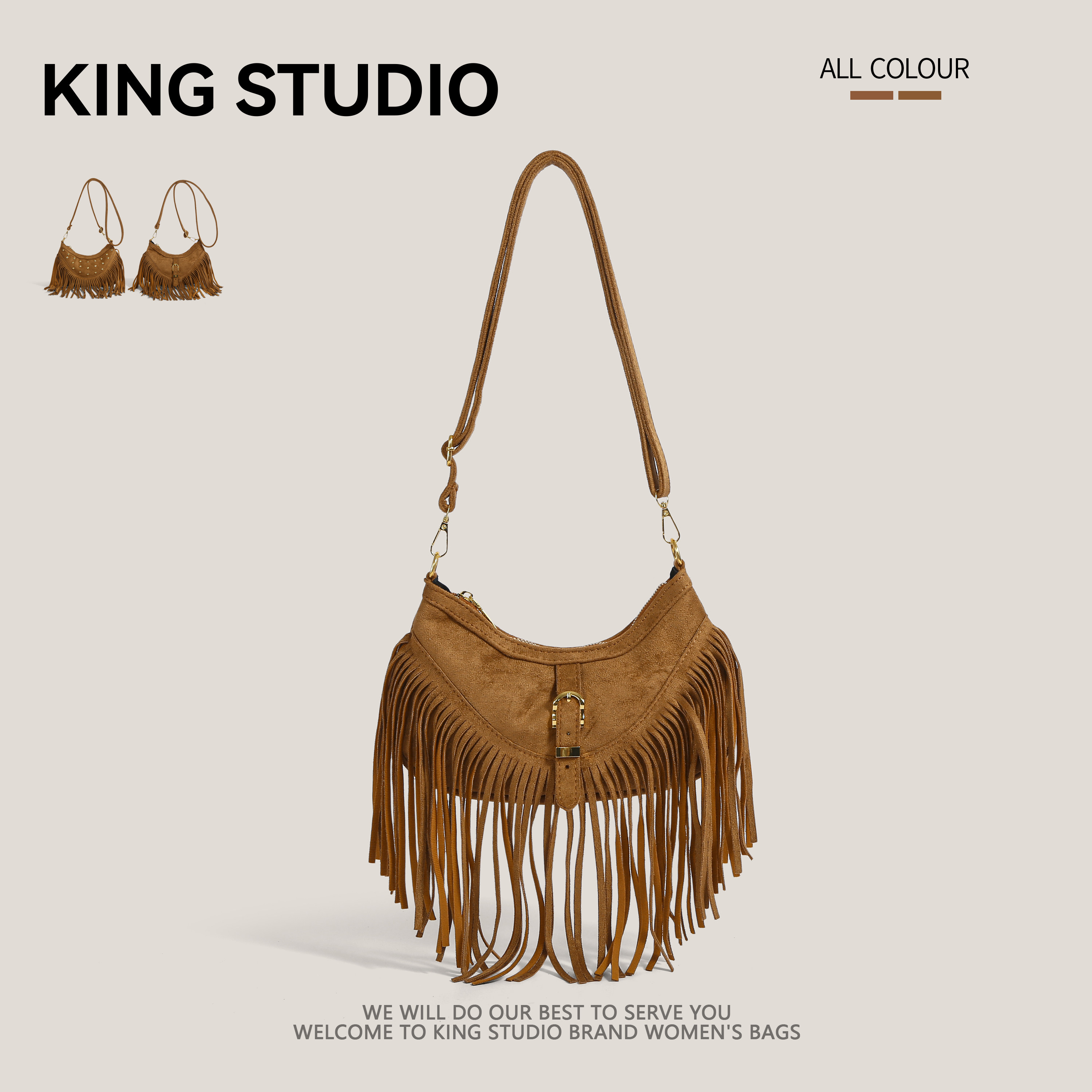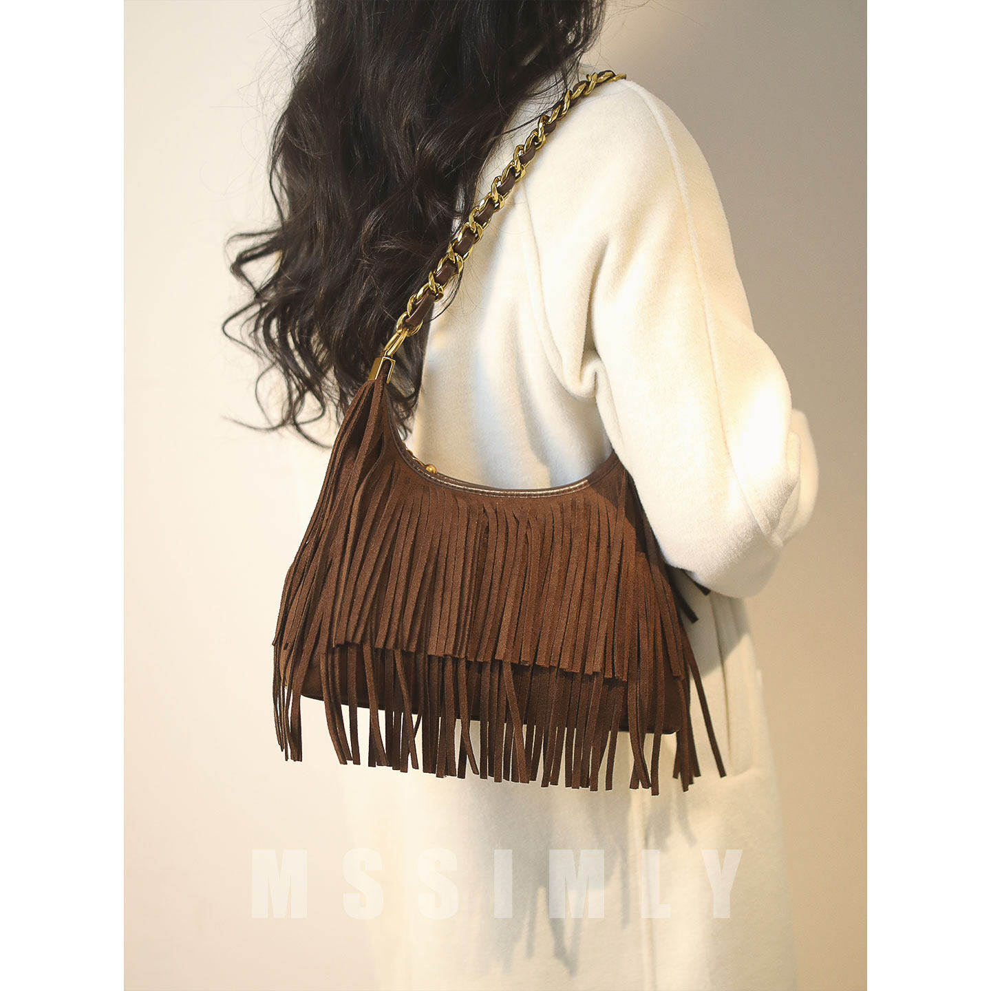 ANGELSKY原创设计手提包单肩麂皮包腋下包流苏包包棕色秋冬新款