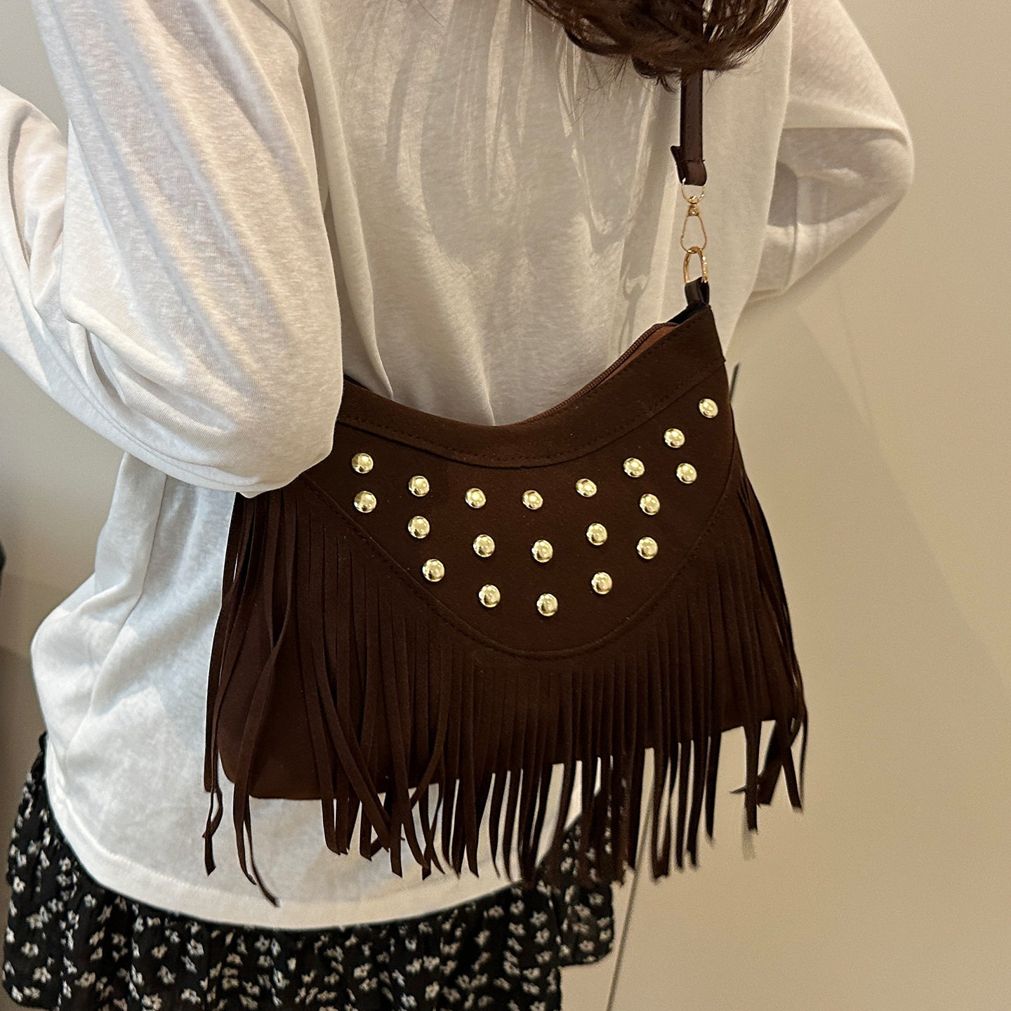 波西米亚流苏包包女2025新款美拉德西部马鞍包小众复古麂皮单肩包