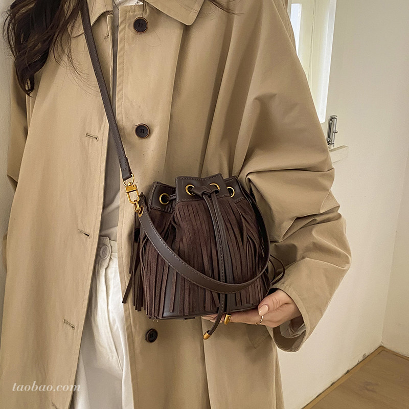 复古流苏包包女2025新款潮美拉德风麂皮绒水桶包百搭ins斜挎包