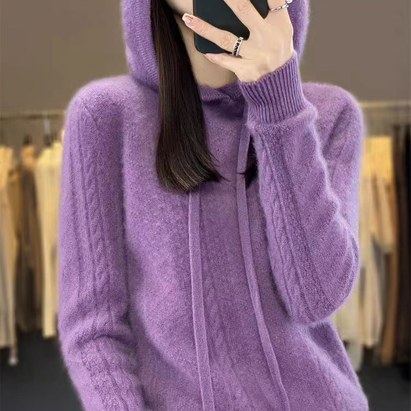 秋冬新款100%纯羊绒衫女扭花连帽卫衣宽松显瘦羊毛针织打底衫韩版