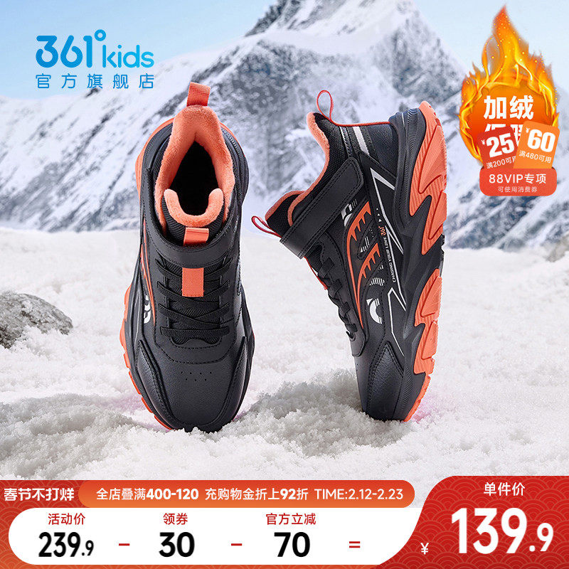 特步男童鞋加绒鞋冬季二棉鞋皮面鞋儿童中大童高帮保暖休闲运动鞋