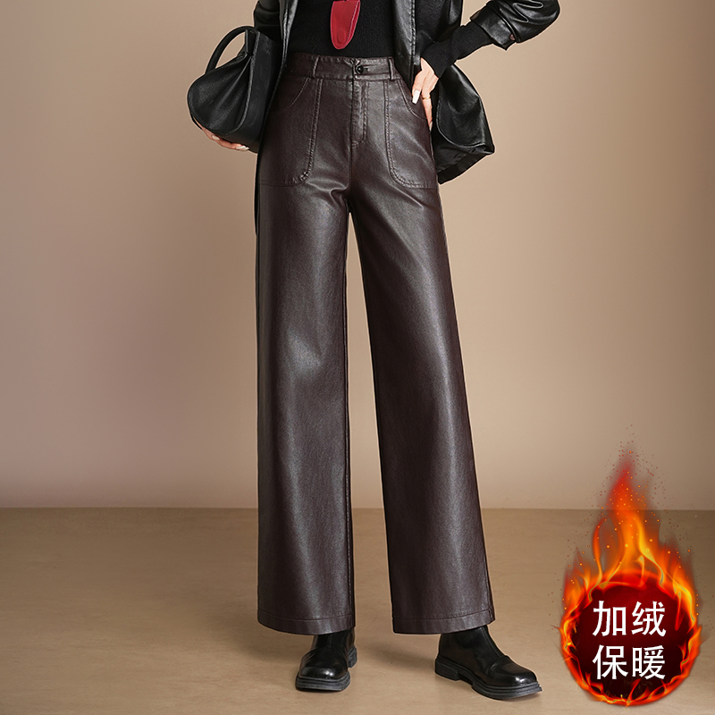 2025秋冬新款直筒皮裤女加绒加厚休闲宽松高腰显瘦柔软阔腿长裤子