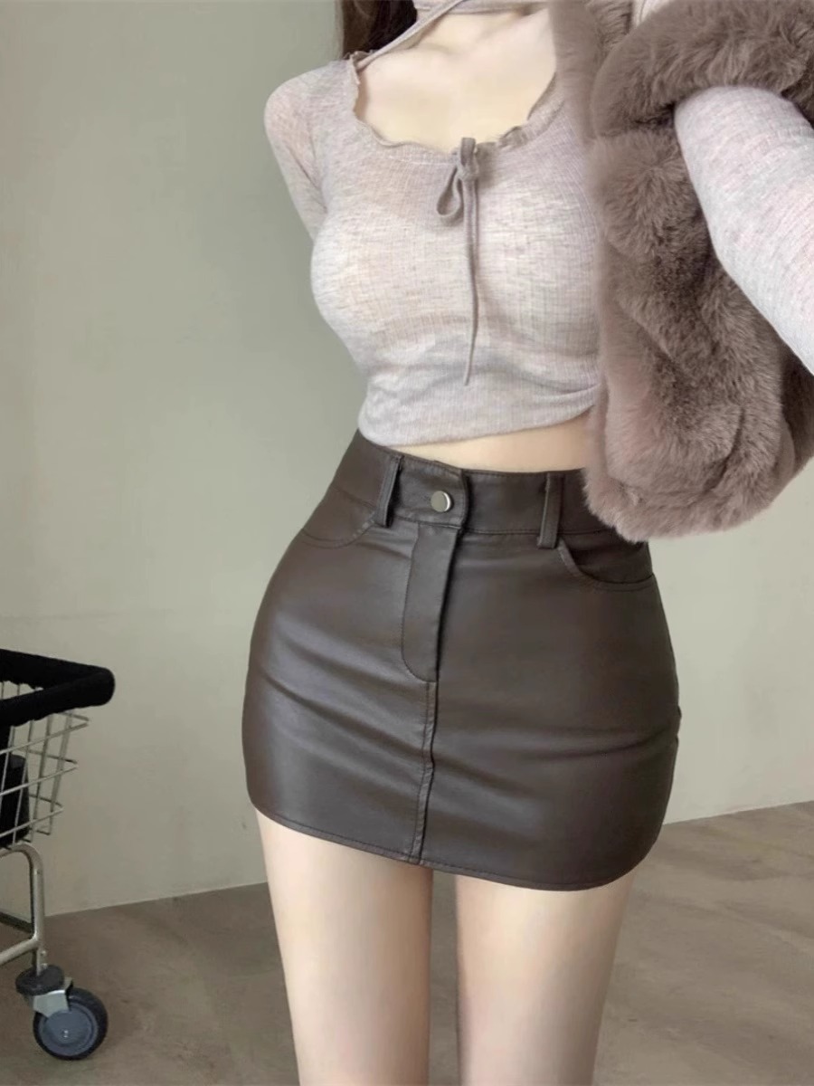 美式棕色高腰PU皮半身裙女2023秋冬新款辣妹黑色皮裙包臀短裙裙子