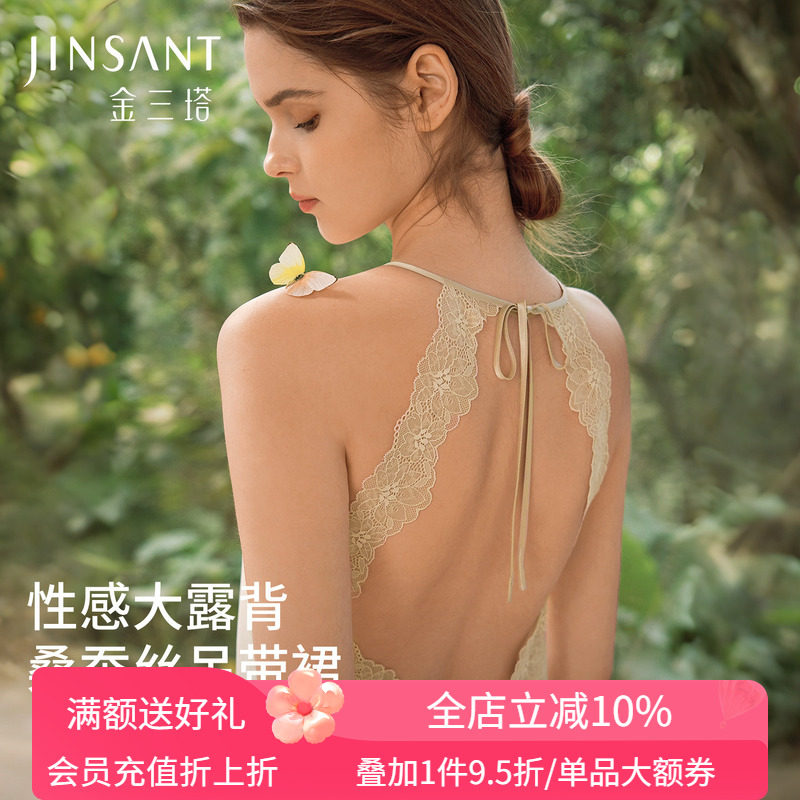 金三塔重磅真丝睡裙女100%桑蚕丝蕾丝性感挂脖露背吊带裙春夏薄款