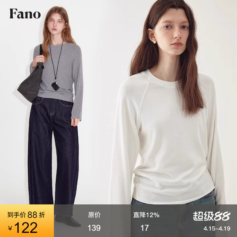 范洛Fano 毛边宽松圆领打底衫长袖T恤女2026春季仿羊绒插肩袖上衣