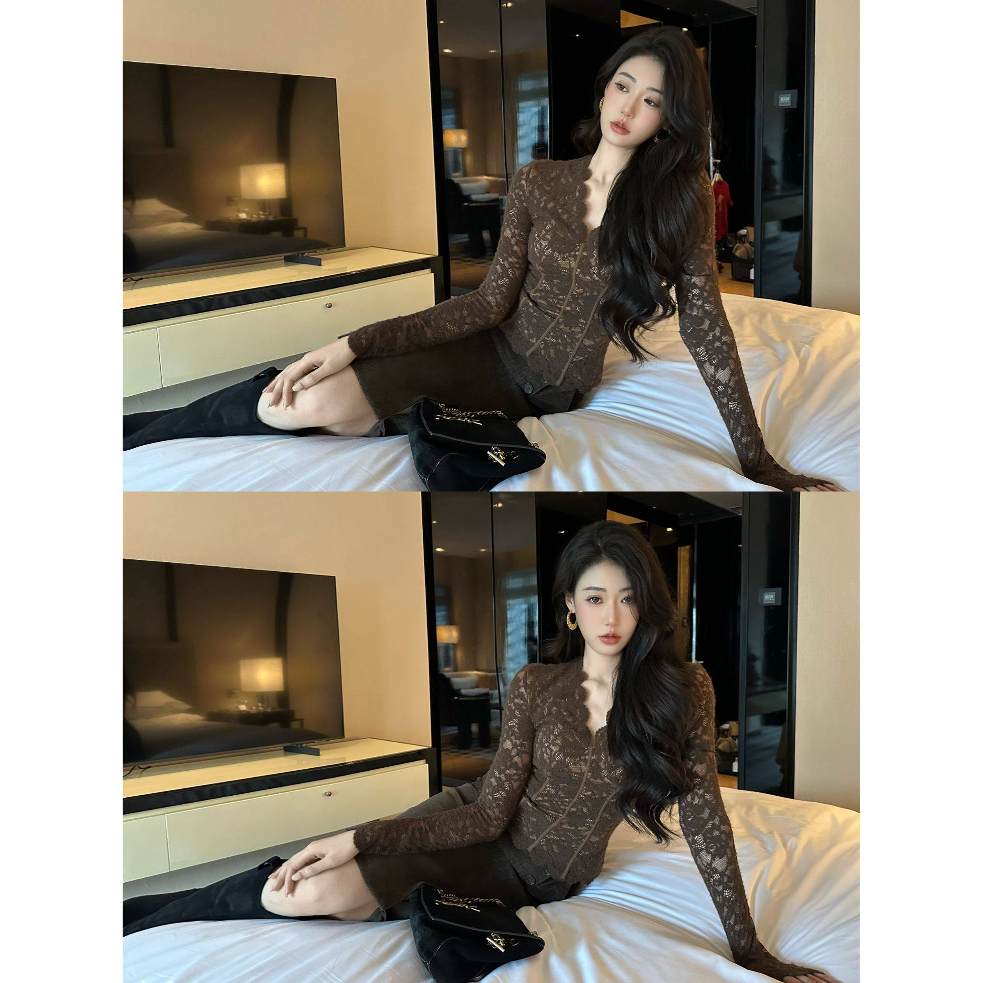 JIJINQI秋冬长袖蕾丝v领上衣性感高级感气质休闲女加绒打底衫单穿
