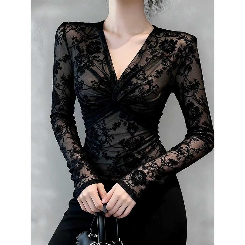 怪力酱 性感蕾丝拼接V领长袖打底衫女秋冬季修身收腰气质内搭上衣