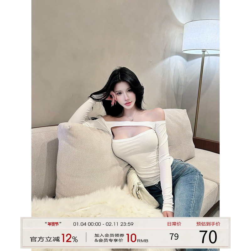 灰尘邓邓 一字肩长袖上衣女2025秋冬性感镂空打底衫白色内搭T恤