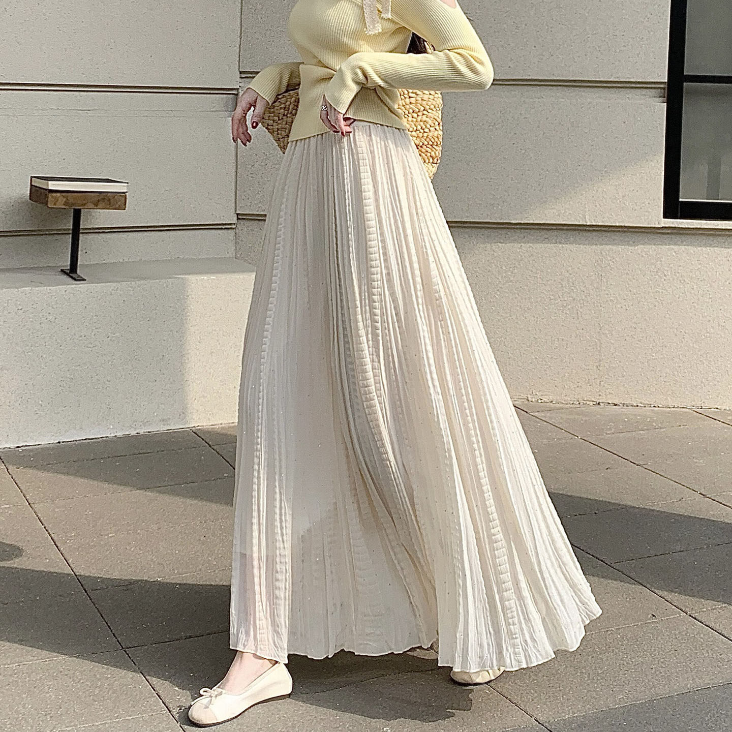 白色雪纺半身裙女春夏2026新款烫钻遮跨大摆长裙子宽松a字百褶裙