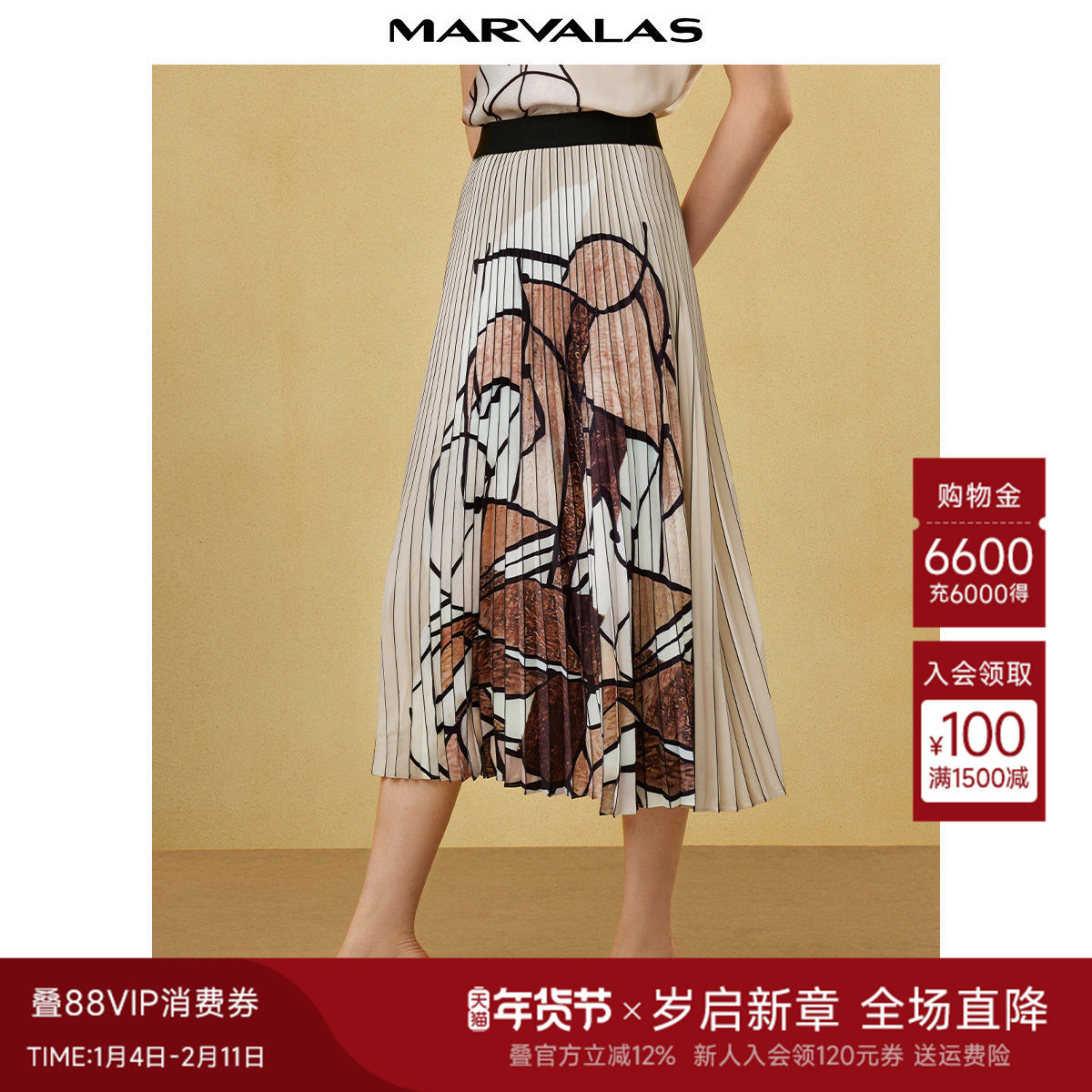 马天奴2025秋冬新款松紧腰印花雪纺半身裙半裙子百褶长裙时尚百搭