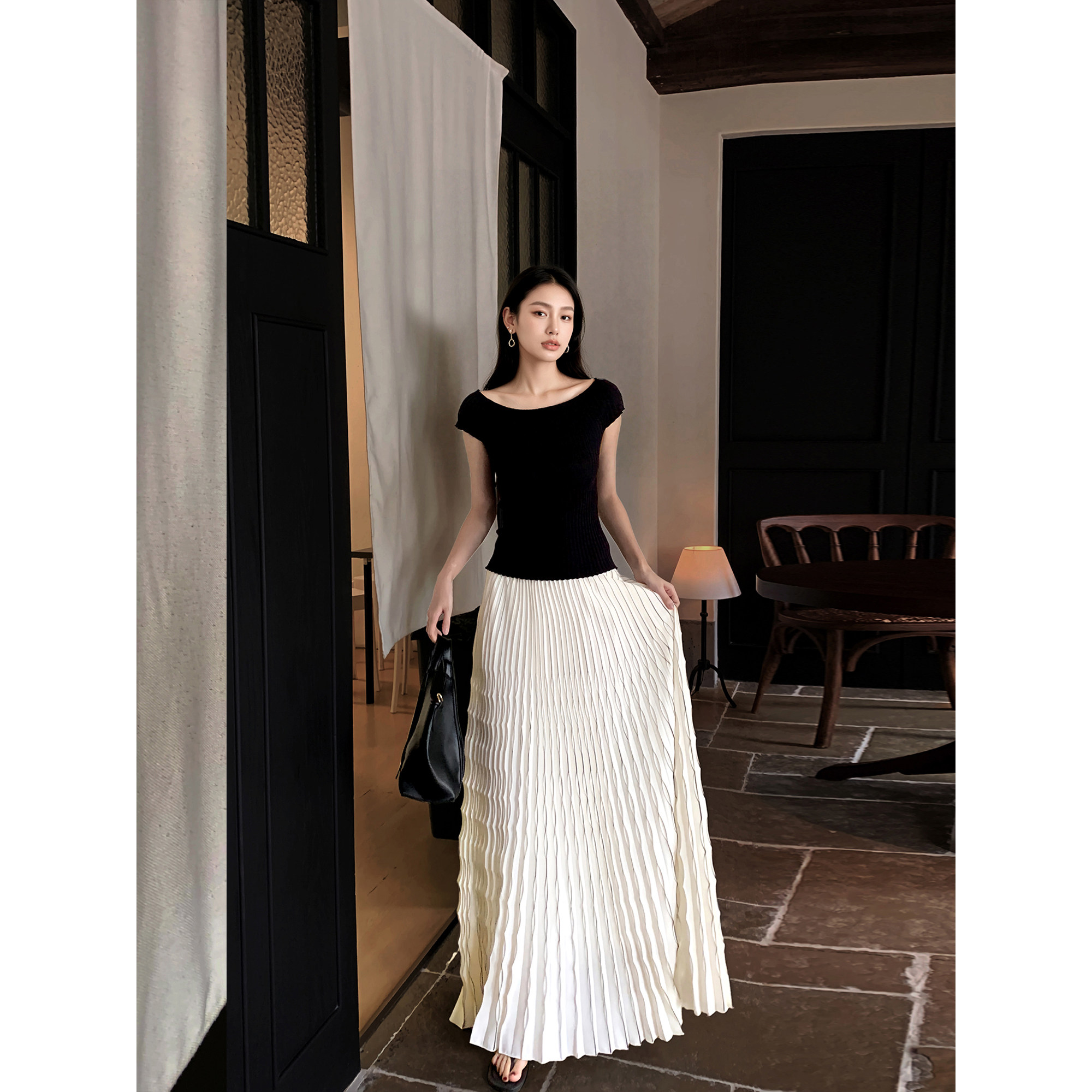 Maven Lin 百褶裙黑色半身裙女高腰设计大摆裙气质a字雪纺长裙