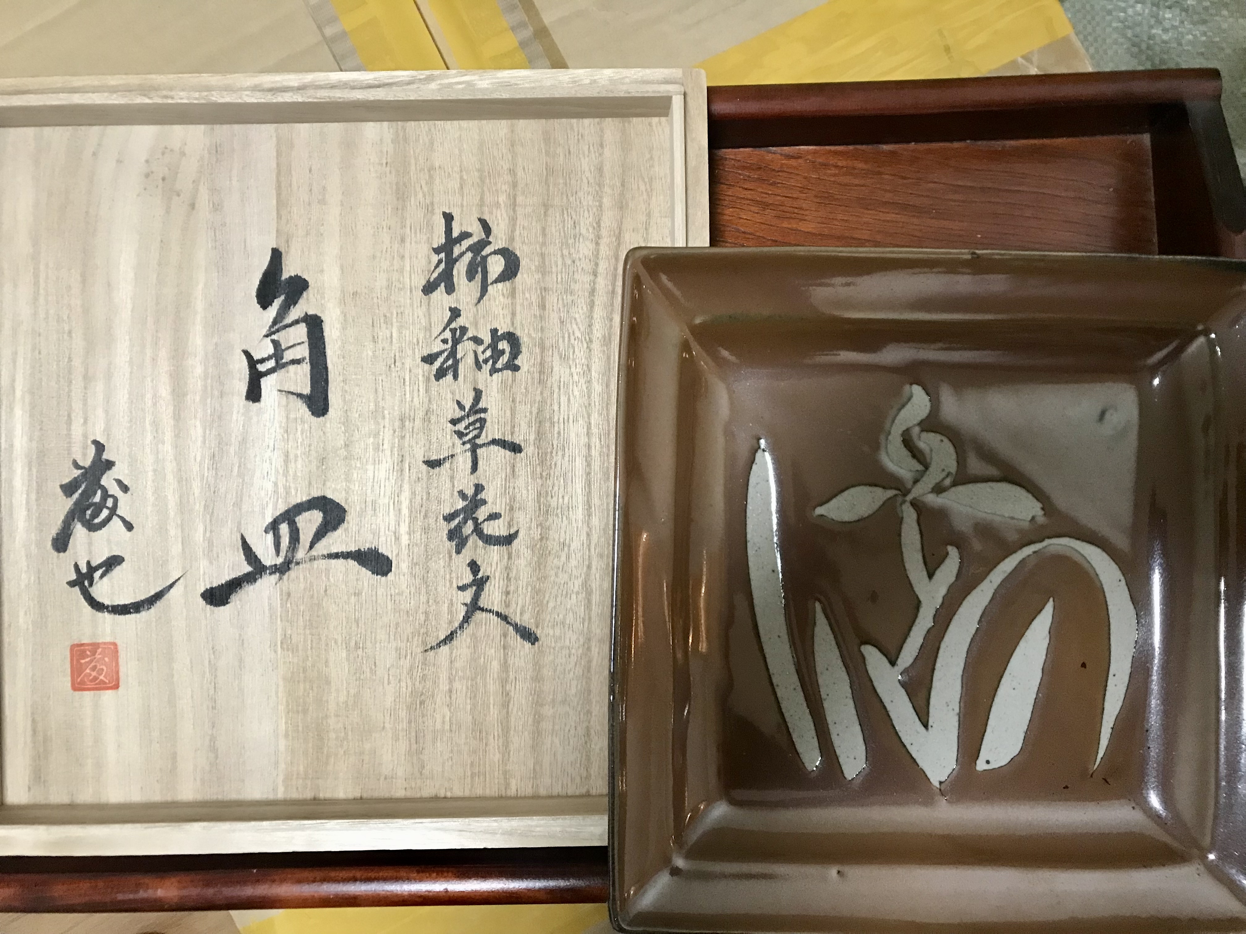160日本进口柿釉草花纹角皿日式复古茶道佐久间藤也名作底部带款