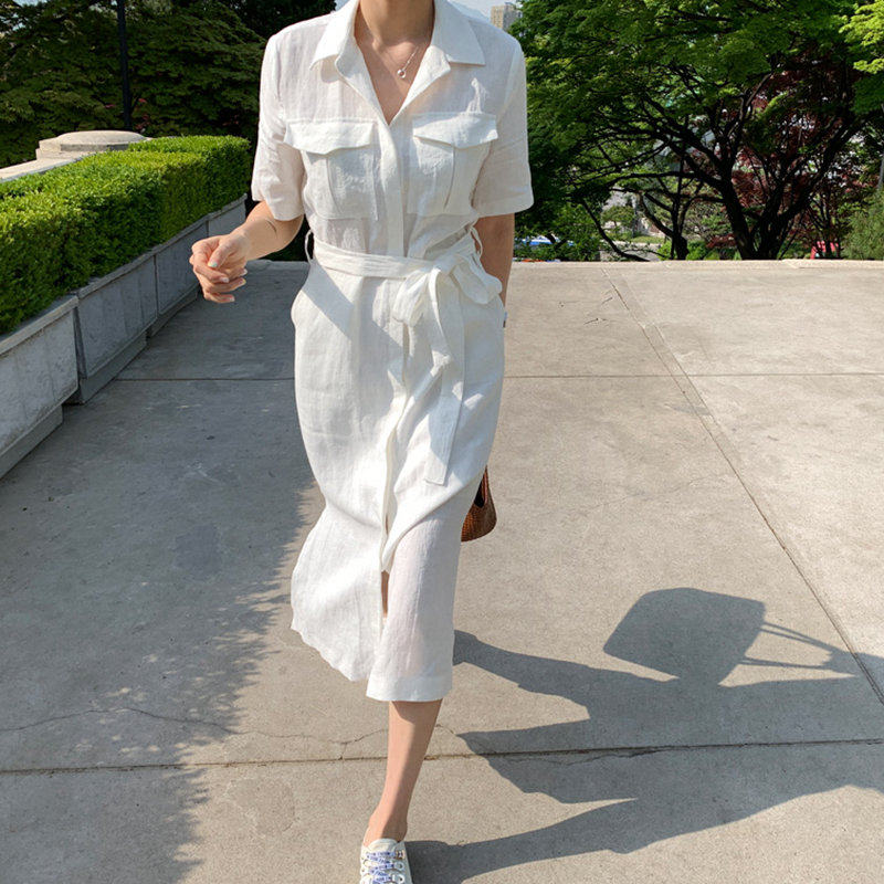 L61韩国女装新款2026亚麻夏季短袖翻连衣裙领腰带通勤显瘦凉爽