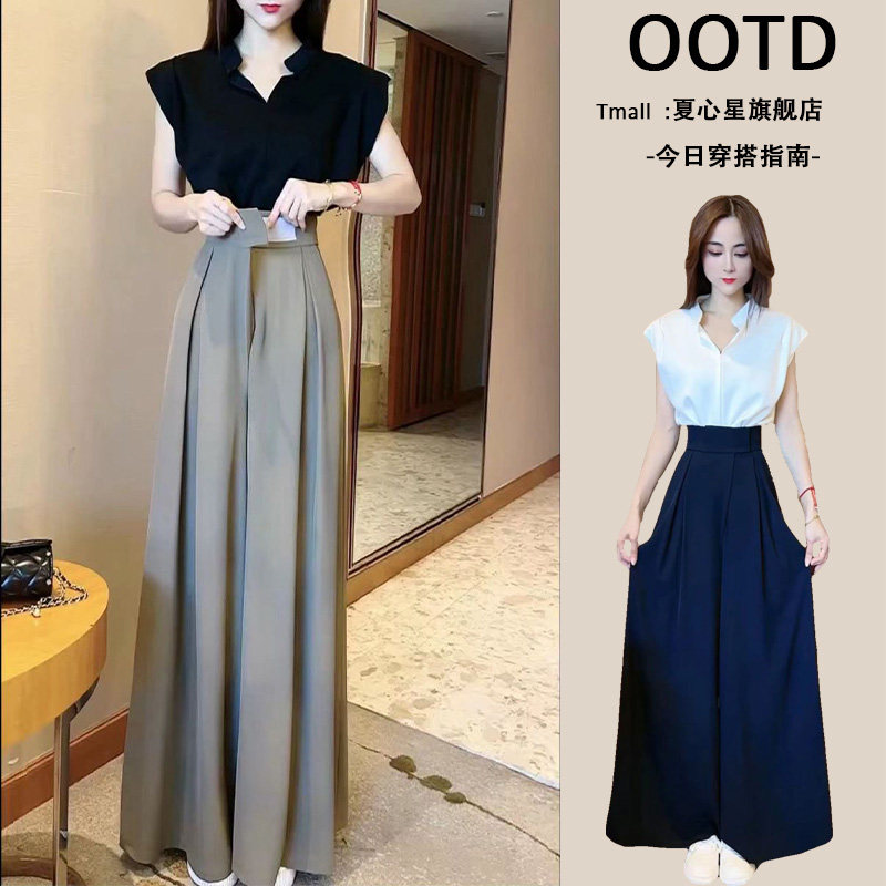 淡人高知穿搭一整套装气质背心宽松无袖衬衫女+垂感高腰阔腿长裤