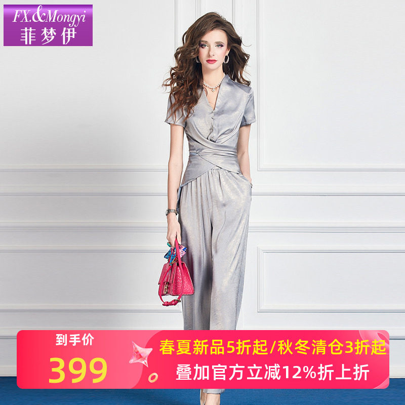 菲梦伊垂感阔腿裤时尚套装女夏季褶皱收腰气质V领上衣宽松长裤子
